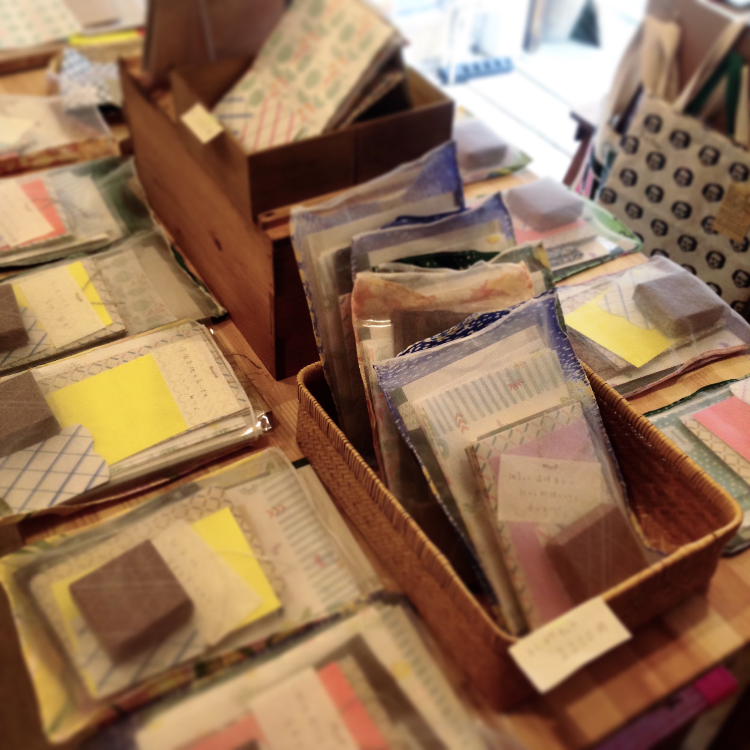 いろいろな紙モノがつまった袋たちが並びます。